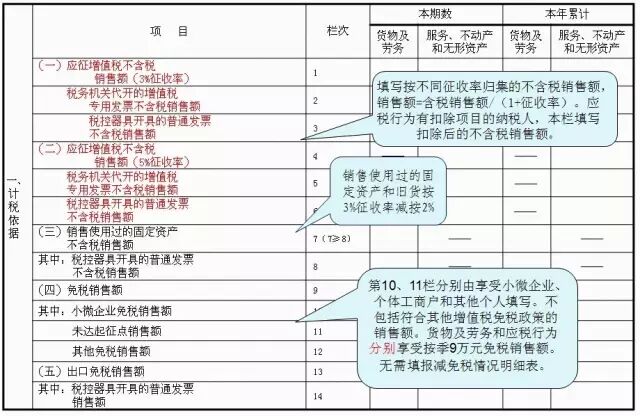 适用于“起征点”政策的判断 小规模纳税人申报表填写之前需要先进行是否达到“起征点”政策的判断, 如未达到“起征点”,不能在主表中第1至8栏填写相关内容。 1.“起征点”标准 按月申报的小规模纳税人,享受小微企业免征增值税优惠政策的销售额为3万元;按季申报的小规模纳税人,享受小微企业免征增值税优惠政策的销售额为9万元。增值税小规模纳税人,实际经营期不足一个季度的,以实际经营月份计算当期可享受小微企业免征增值税政策的销售额度。 2.“起征点”口径 增值税小规模纳税人销售货物劳务的销售额和销售服务、无形资产的销售额分别适用“起征点”政策。有差额扣除项目的小规模纳税人,“起征点”销售额口径为扣除前的不含税销售额。货物劳务“起征点”销售额为“应征增值税不含税销售额(3%征收率)”“销售使用过的固定资产不含税销售额”、“货物劳务免税销售额”、“货物劳务出口免税销售额”之和。服务、无形资产“起征点”的销售额为“服务、无形资产扣除前应征增值税不含税销售额(3%征收率)”、“服务、无形资产扣除前应征增值税不含税销售额(5%征收率)”、“服务、无形资产免税销售额”、“服务、无形资产出口免税销售额”之和。 《增值税纳税申报表(适用于小规模纳税人)》填写关键点