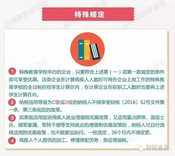 (4)《财政部国家税务总局关于促进残疾人就业税收优惠政策的通知》(财税〔2007〕92号)第二条规定:对单位按照实际安置的每位残疾人取得的增值税退税或营业税减税收入,免征企业所得税。