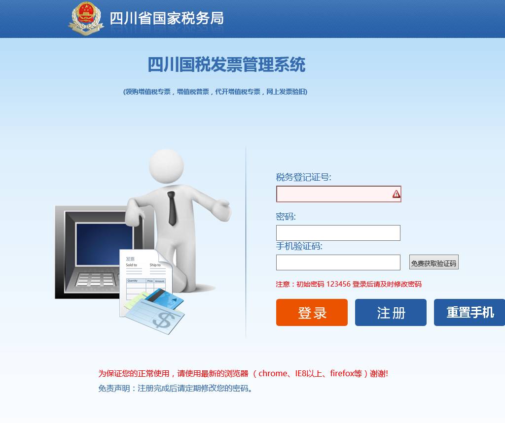 注意:直接通过输入税务登记证号,密码(初始密码为123456)和手机验证码,点击登陆进入系统。