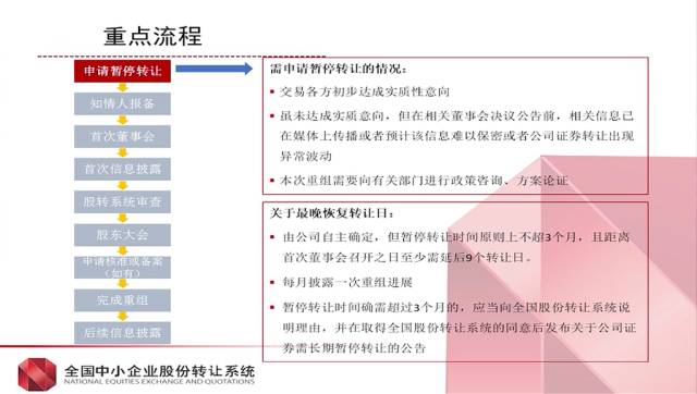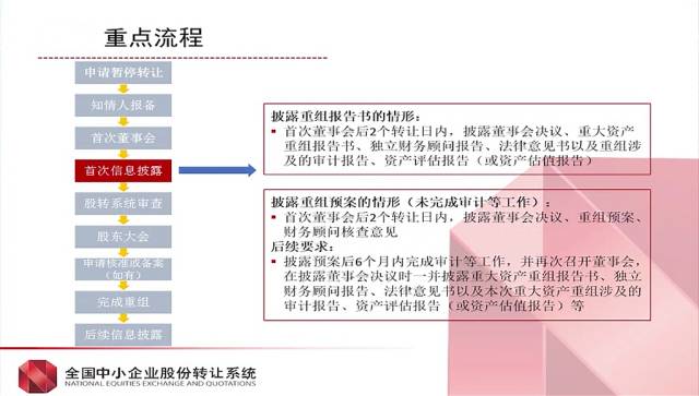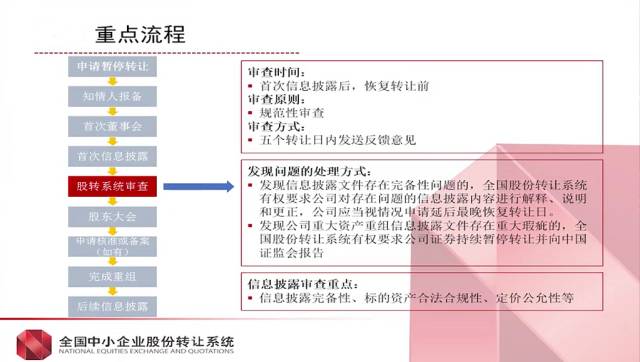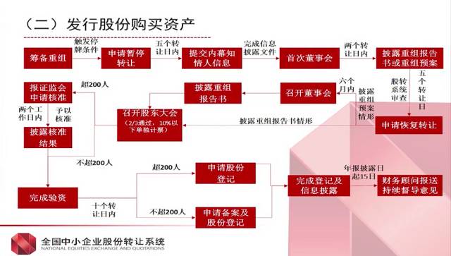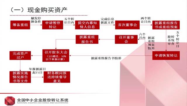 申请暂停转让——知情人报备——首次董事会——首次信息披露——股转系统审查——股东大会——申请核准或备案(如有)——完成重组——后续信息披露资产的购买方式: