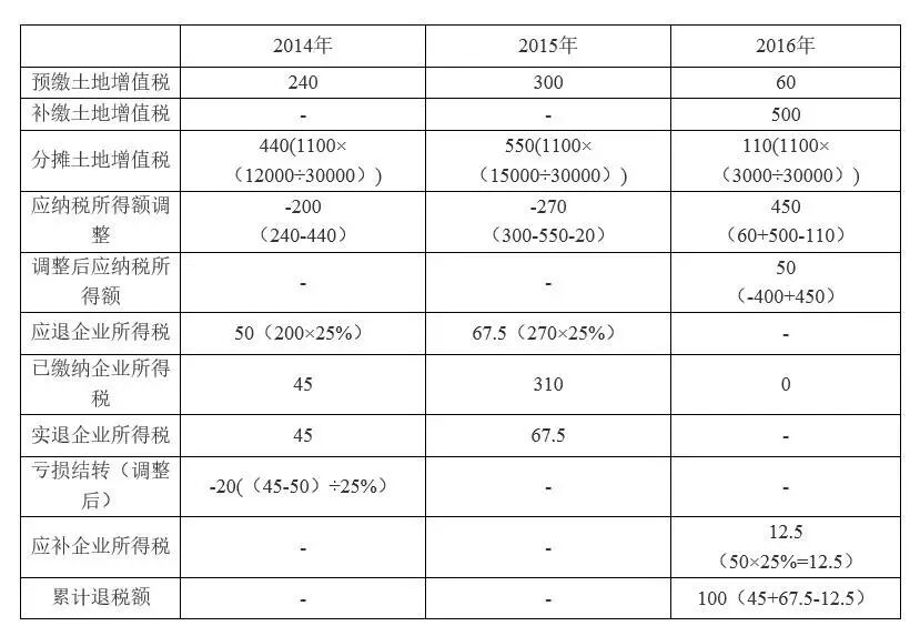 某房地产开发企业2014年1月开始开发某房地产项目,2016年10月项目全部竣工并销售完毕,12月进行土地增值税清算,整个项目共缴纳土地增值税1100万元,其中2014年—2016年预缴土地增值税分别为240万元、300万元、60万元;2016年清算后补缴土地增值税500万元。2014年—2016年实现的项目销售收入分别为12000万元、15000、3000万元,缴纳的企业所得税分别为45万元、310万元、0万元。该企业2016年度汇算清缴出现亏损,应纳税所得额为-400万元。 企业没有后续开发项目,拟申请退税,具体计算详见下表: