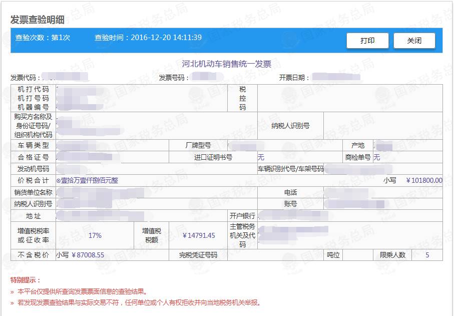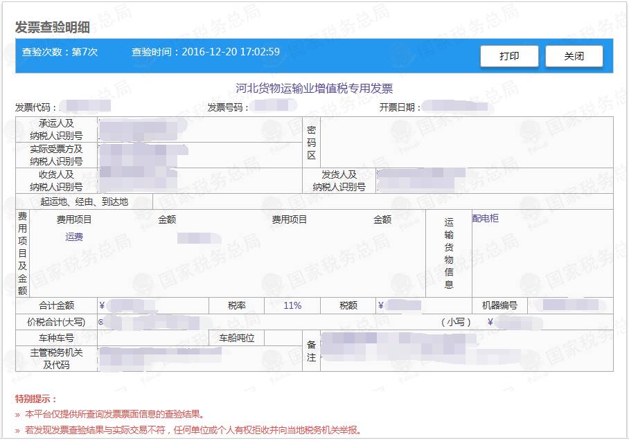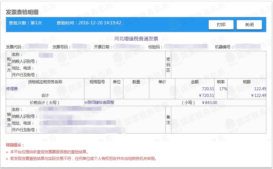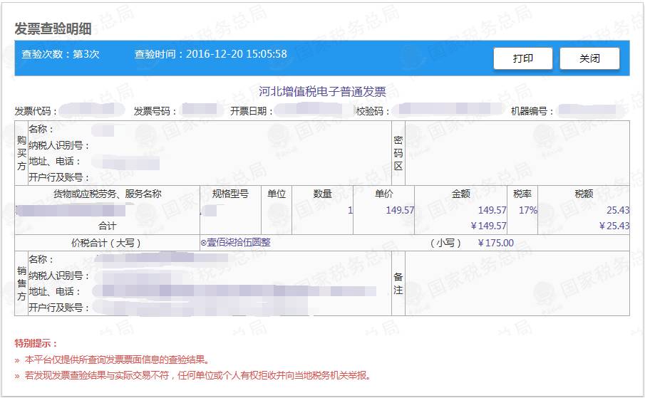3. 确认输入的信息无误后,点击查验按钮,系统自动弹出查验结果: