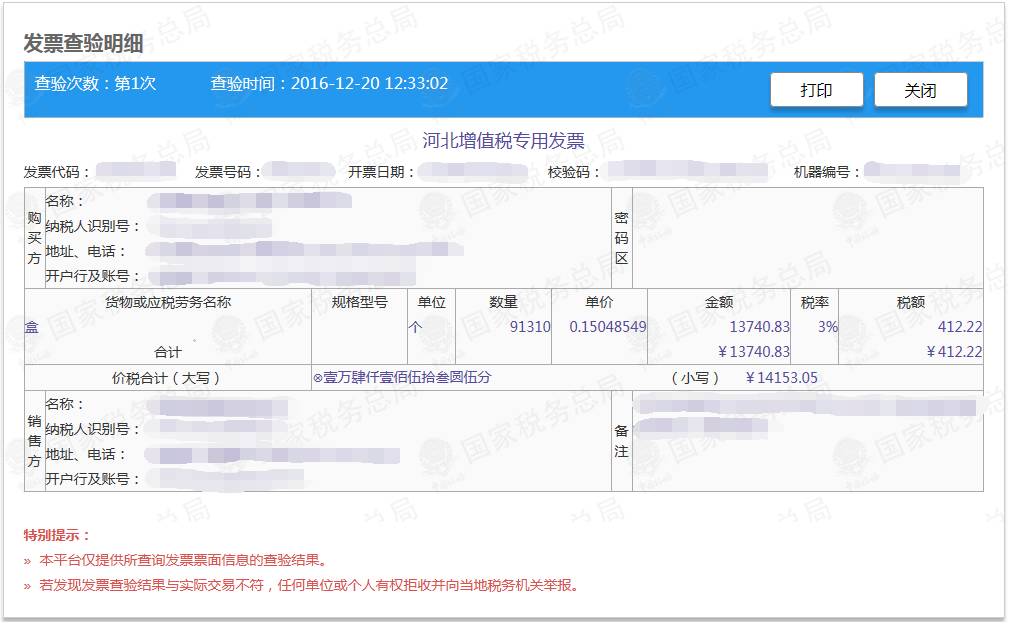 特别提示:《中华人民共和国发票管理办法》规定:不符合规定的发票,不得作为财务报销凭证,任何单位和个人有权拒收。付款方取得发票后应及时核对发票开具内容是否真实、项目填写是否齐全、加盖的发票专用章是否与收款方一致。对于违反发票管理法规的行为,任何单位和个人有权举报。