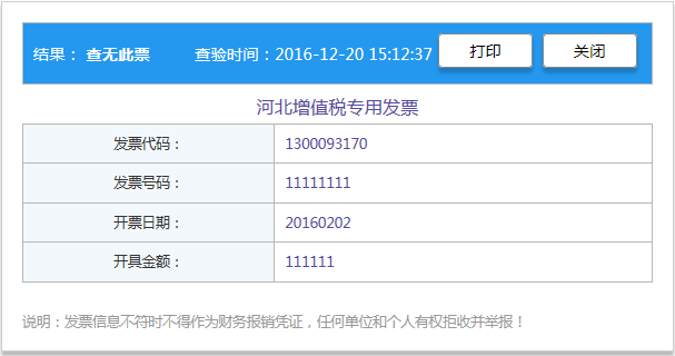 (4)查无此票:由于存在开具方离线自开票、发票电子数据的同步滞后(通常至少1天)、查验人录入错误等问题,导致相关发票在税务机关的电子信息中无法检索到。如果确认输入项无误后,请于第二天再行查验。
