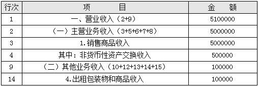 按照表式结构,该纳税人应在主营业务收入中销售商品收入填写500万,非货币性资产交换收入中应填写50万元,其他业务收入出租包装物和商品收入中应填写10万元,收入共计510万元。