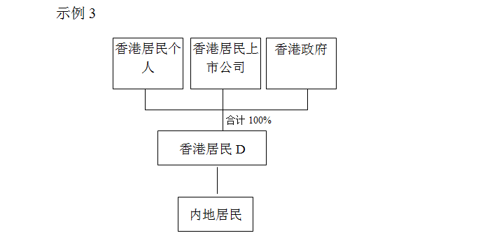 示例3投资架构,香港居民D投资内地居民并取得股息,直接持有香港居民D100%股份的人为香港政府、香港居民且在香港上市的公司或香港居民个人,可直接判定香港居民D具有“受益所有人”身份。