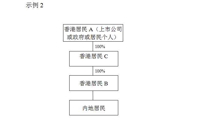 示例2投资架构,香港居民B投资内地居民并取得股息时,香港居民A通过香港居民C间接持有香港居民B100%股份,如果香港居民A为香港政府、香港居民且在香港上市的公司或香港居民个人,可直接判定香港居民B具有“受益所有人”身份。