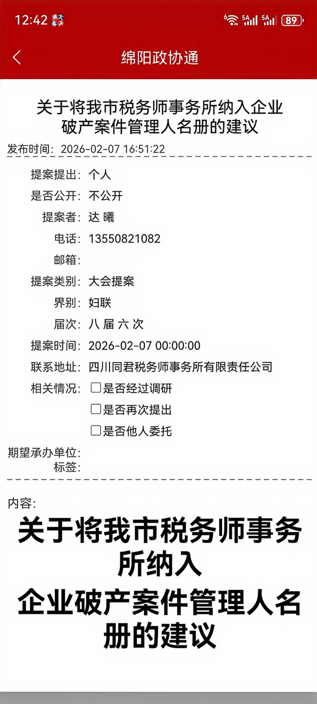 会议期间,达曦常委立足财税行业专业所长,深耕一线调研、精准对接发展需求,紧扣实体经济纾困、绿色低碳转型、营商环境优化、企业破产处置等关键领域,认真履行政协委员职责。她精心准备并提交《关于将我市税务师事务所纳入企业破产案件管理人名册的建议》提案,紧扣绵阳企业发展实际与司法实践需求,针对性提出完善破产管理人选任范围、发挥税务专业力量在破产清算、债权审核、税务合规等环节的重要作用,为健全企业退出与救治机制、助力经济高质量发展提供了专业可行的参考思路。