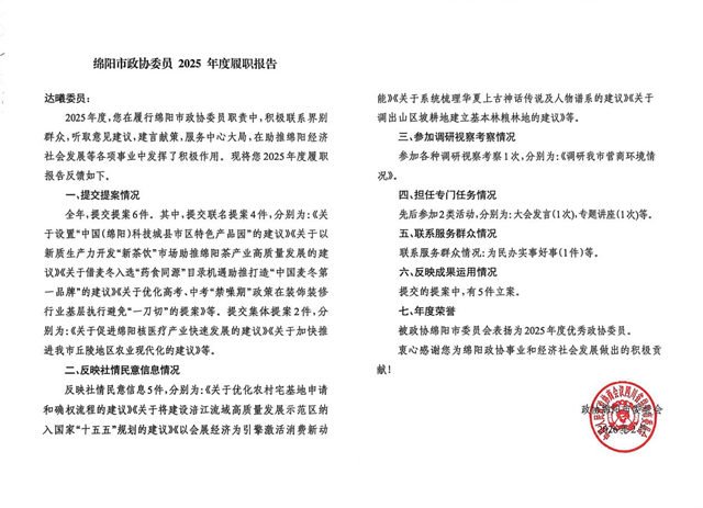 履职尽责显担当 建言献策促发展-达曦所长 荣获绵阳市优秀政协委员 倾情履职市政协八届六次会议