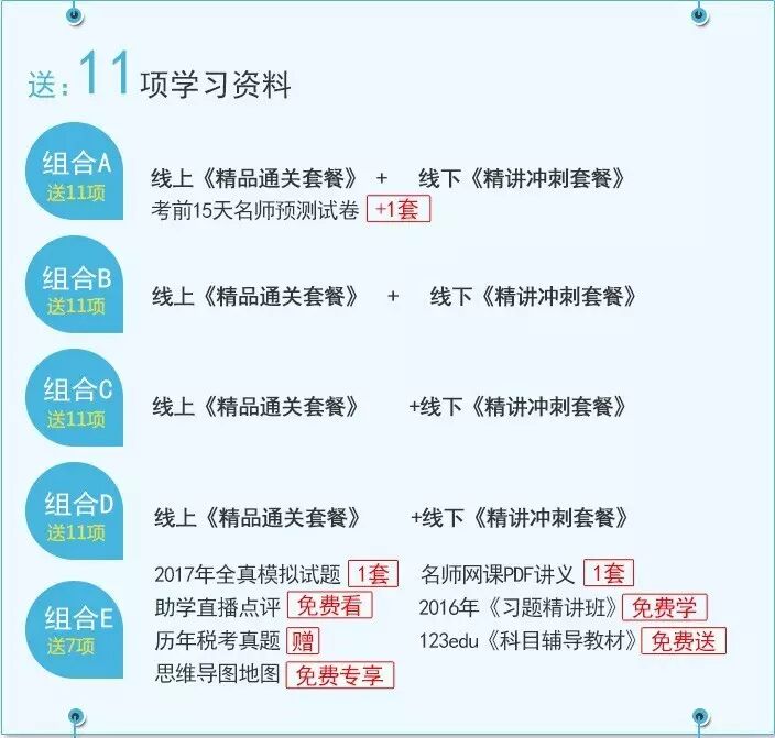 学习使人快乐,学习使人进步! 想一次过关的都看下来 …… 1. 税务师为什么非考不可? 2. 特色服务:“证书+就业”双丰收 3. 名师授课,税考无忧 4. 精典套餐,通关无忧 4.1 线上《精品通关套餐》 重点难点,脉络清晰,精炼考题,直击考点 4.2 线下《精讲冲刺套餐》 去年押题命中率达80% 名师面授,独传技巧,精准押题,剑指通关! 融汇线上线下精华,融通重点难点考点,“证书+专业”双丰收 5. 单班购买,选择无忧 6. 精华班次,学习无忧 “123在线教育”考试培训正在火热招生中!详情咨询客服:400-0643-123 小编在此预祝各位考生2017年税考一次通关! 点击左下角阅读原文,查看详情!(招生方案详情以官网专题页为准)
